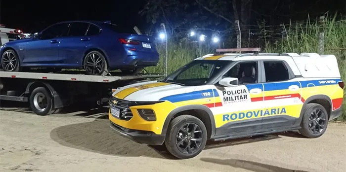 Um veículo BMW, modelo 330E, azul, ano 2022, com placas de São Paulo/SP, foi apreendido pela Polícia Militar Rodoviária em Além Paraíba na noite deste sábado (17)
